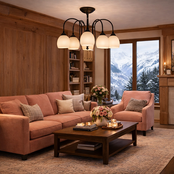 Diese sechsflamige Deckenleuchte verbindet klassische Linienführung mit moderner Zurückhaltung. Die geschwungenen Metallarme in braun-schwarz getupft tragen opalweiße Glasschirme, die ein angenehm warmes, blendfreies Licht erzeugen. Dadurch entsteht eine harmonische Lichtverteilung, die Wohnräume nicht nur erhellt, sondern spürbar Atmosphäre schafft.