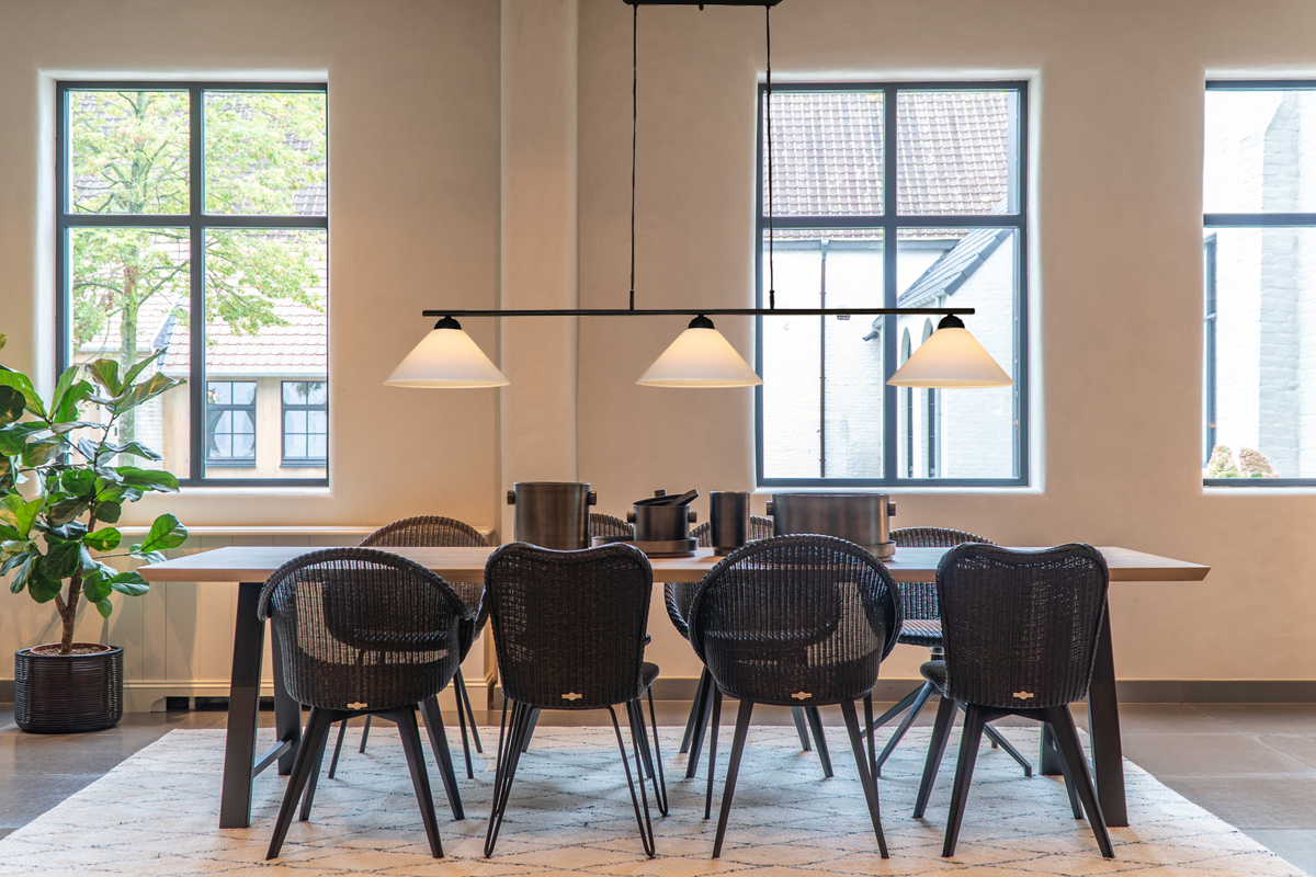 Im Erdgeschoss zeigen wir Design Leuchten in Verbindung mit Esstischen und Polstermöbeln.