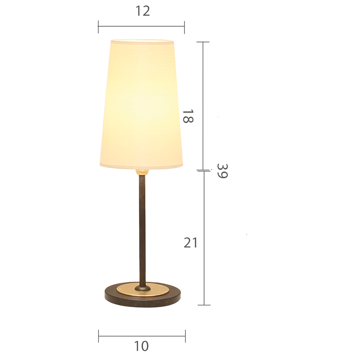 Die Tischlampe besticht durch ihre sorgfältige Materialauswahl: Ein braun-schwarz getupftes Eisenfußteil, das mit einem dekorativen Blattgold-Element veredelt ist. Der konische Schirm mit einem Durchmesser von 12 cm ist in verschiedenen Farben erhältlich und verleiht jedem Raum eine persönliche Note. Die Kombination aus robuster Verarbeitung und eleganter Optik macht diese Lampe zu einem zeitlosen Klassiker.