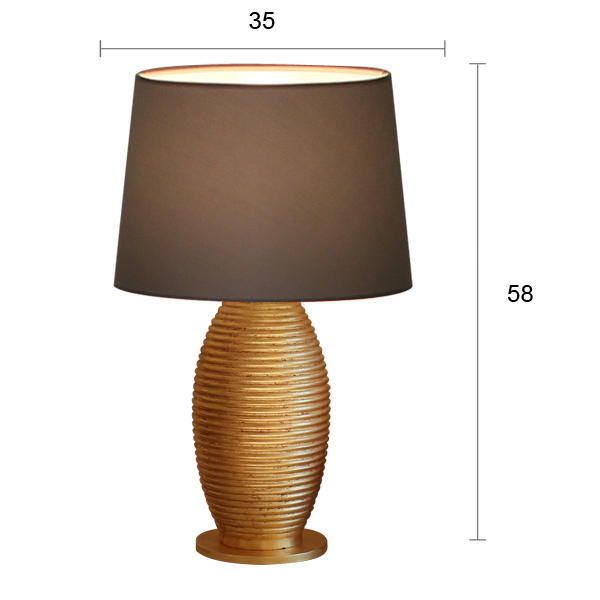 Die Tischleuchte besticht durch ihren hochwertigen Holzfuß und eine elegante Sockelplatte aus Eisen mit Blattgold-Finish. Der runde Chintz-Schirm, der mit einem Durchmesser von 35 cm überzeugt, bietet eine angenehme Lichtstreuung. Die Möglichkeit, die Schirmfarbe individuell anzupassen, erlaubt es Ihnen, die Leuchte perfekt in Ihr Interieur zu integrieren.