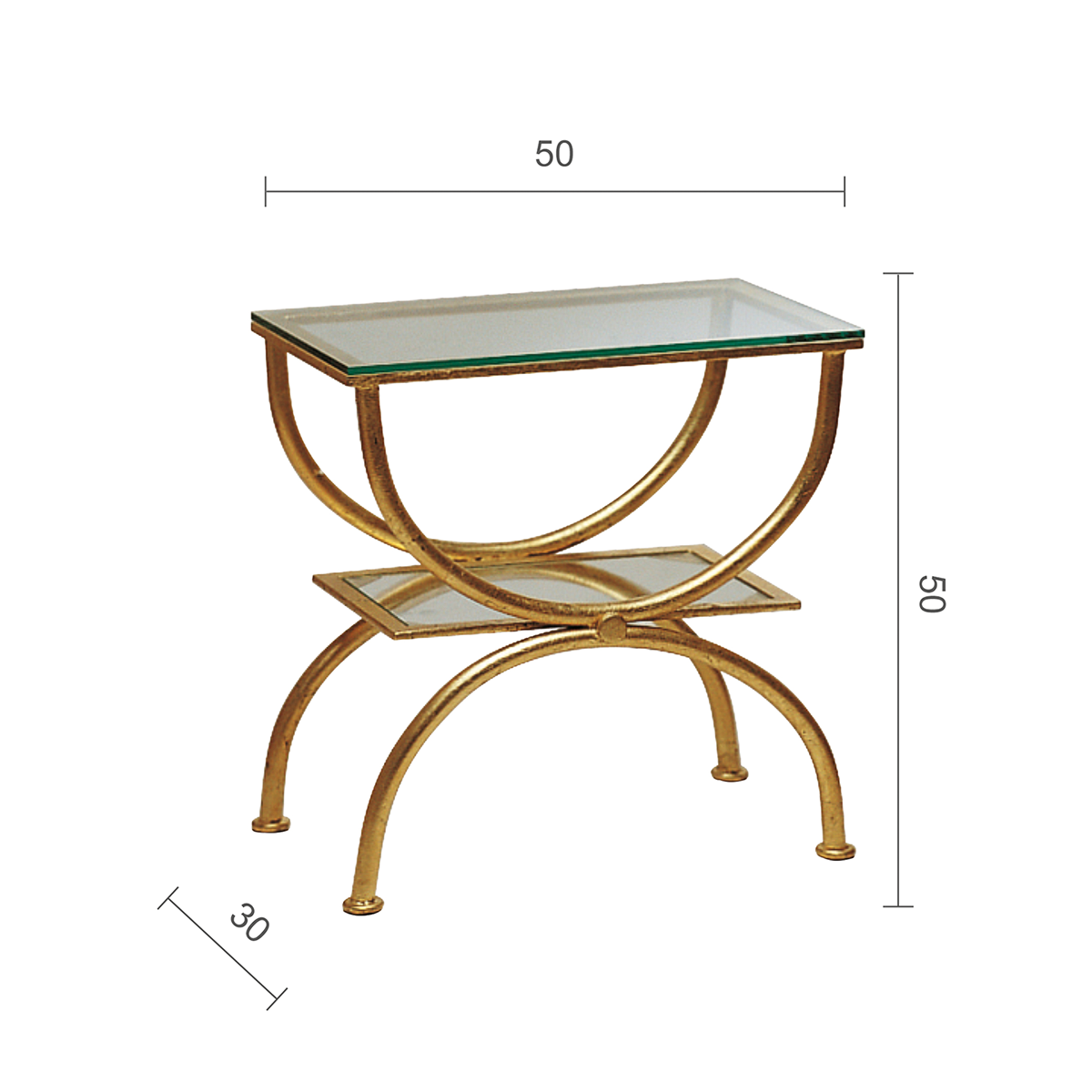 Der rechteckige Country Beistelltisch ist ein Meisterwerk aus Eisen mit einem edlen Blattgold-Finish. Mit seinen Maßen von 50 x 30 cm und einer Höhe von 50 cm bringt er sowohl Eleganz als auch Funktionalität in Ihr Zuhause.