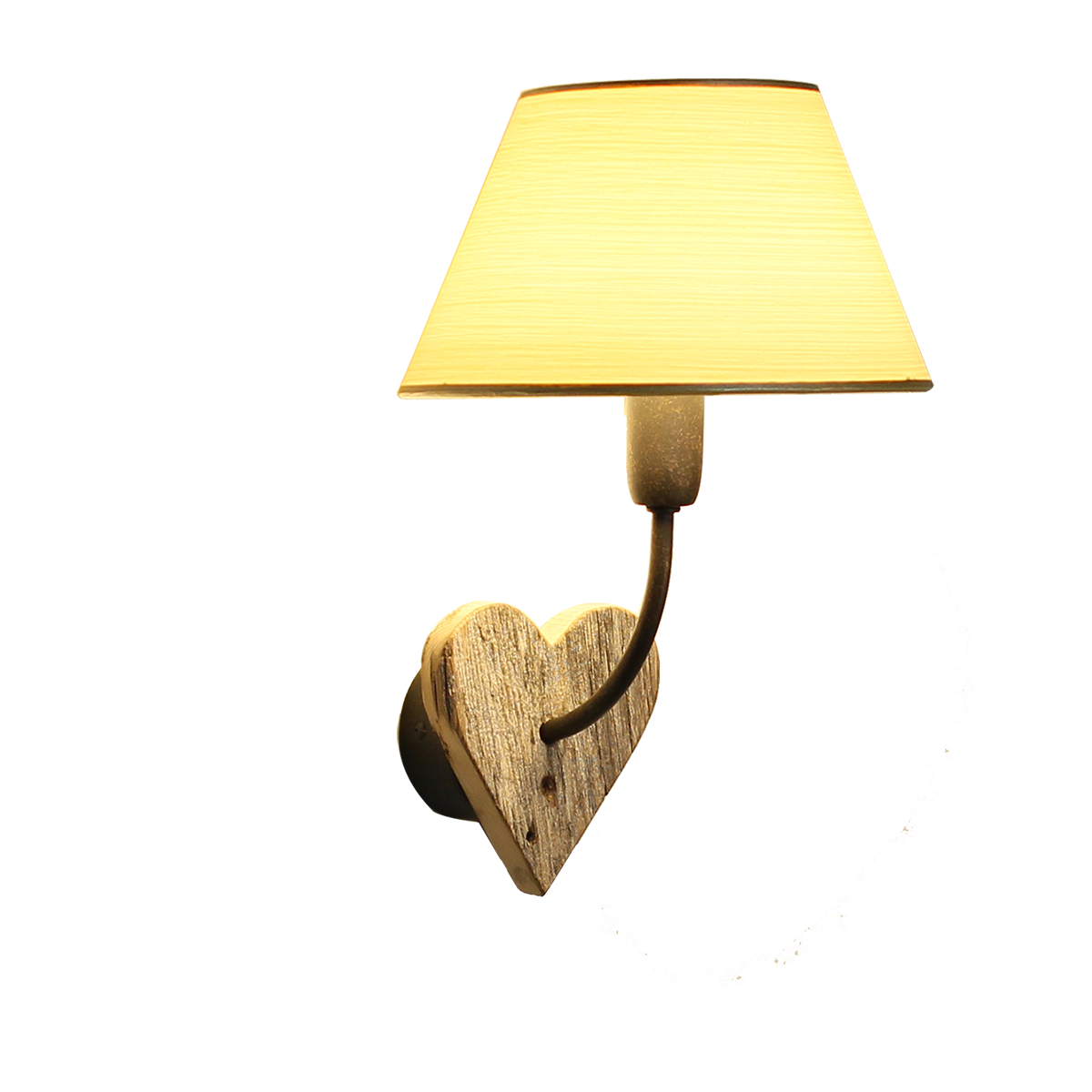 Die Kombination aus braun-schwarz getupftem Eisen und einem nicht wechselbaren Altholz Herz verleiht dieser Wandleuchte einen unverwechselbaren Charakter. Der runde Schirm in Strichlack-Optik ist in verschiedenen Farben erhältlich, sodass Sie Ihre individuelle Note einbringen können.