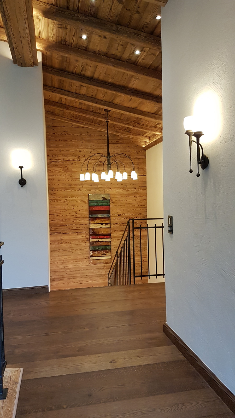 Für ein extravagantes und individuelles Flair in dieser exclusiven Villa sorgt unsere „Deco Plattform“, die wir 4 m über einem großem Esstisch abgehängt haben. Sowohl oben als auch unten ist sie getrennt dimmbar. Die „Deco Plattform“ kann immer wieder, entsprechend des Anlasses oder der Jahreszeiten individuell dekoriert werden. Im Treppenhaus erstrahlt unsere große 14-flammige Krone mit edlen Scavo Gläsern.