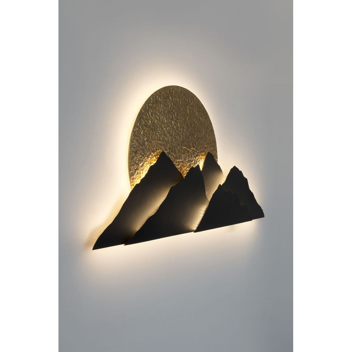 Die "Montagna" besticht durch ihr detailreiches Design, das eine majestätische Berglandschaft darstellt. Die stilisierte Sonne im Hintergrund, gefertigt aus gehämmertem Gold, rundet das Panorama harmonisch ab. Die Farbgebung aus Eisen in Braun, Schwarz und Gold verleiht der Leuchte eine natürliche Eleganz und macht sie zu einem echten Blickfang. Mit einer imposanten Höhe von 70 cm, einer Länge von 150 cm und einer Tiefe von 8 cm bringt die "Montagna" ein Stück Natur in Ihre Räume.
