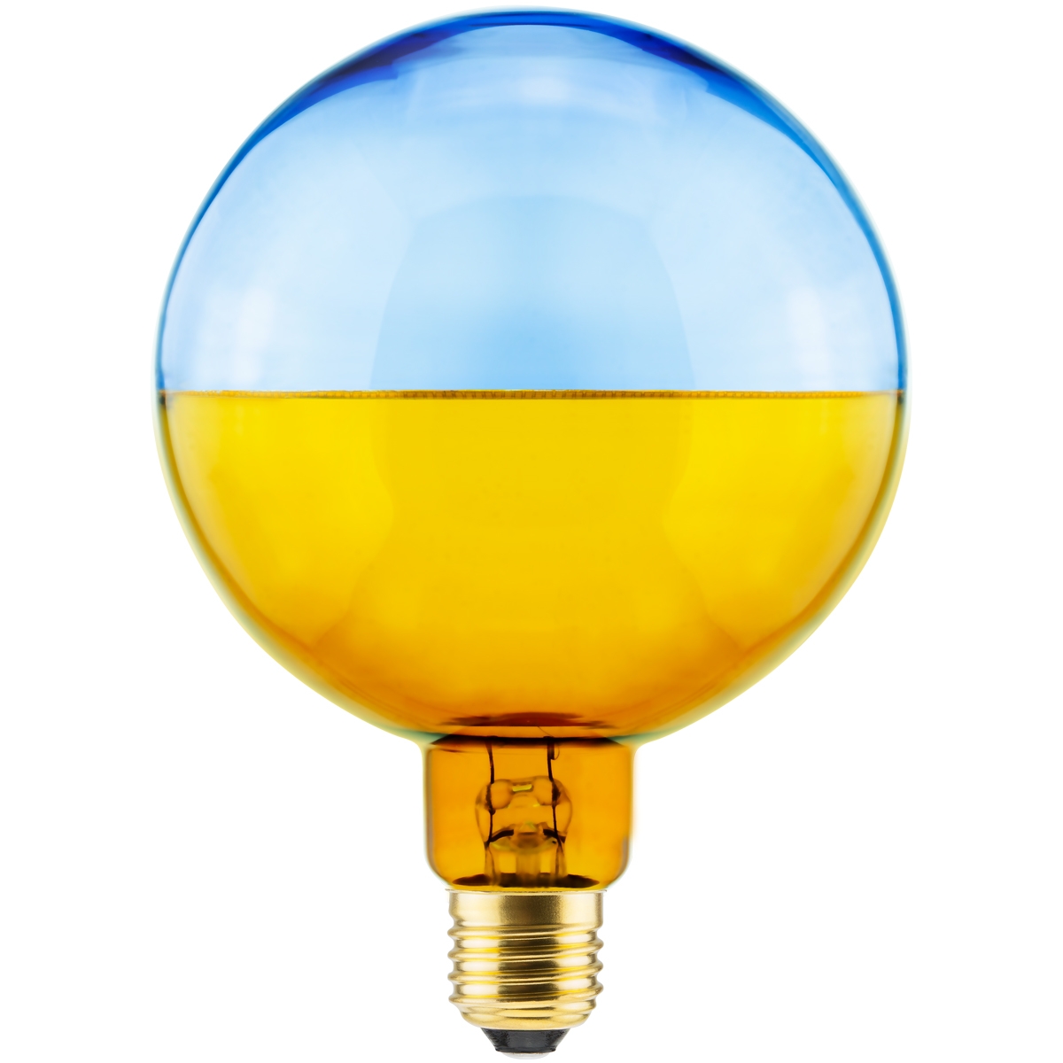 Mit einem Durchmesser von 12,5 cm und einer Höhe von 18 cm ist dieses Globe-Leuchtmittel perfekt geeignet für Pendelleuchten, Tischlampen oder Wandlampen mit sichtbarem Leuchtmittel. Die zweifarbige Gestaltung in Amber/Blue erzeugt einen einzigartigen Illusionseffekt, der das Licht kunstvoll bricht.