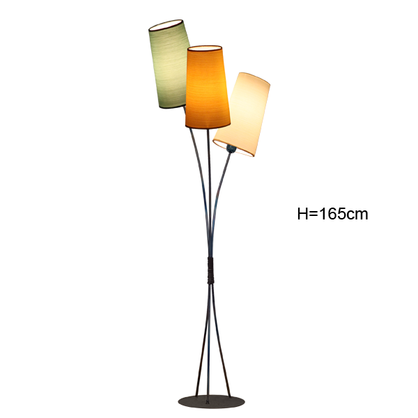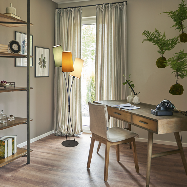 Diese dekorative Standleuchte besticht durch ihre Konstruktion aus robustem Eisen in edlem Braun-Schwarz. Die drei Stangen bieten eine stabile Basis, während die Schirme in Strichlack in den Farben Herbarium-Grün, Washed Linen-Creme und Klassik Orange optional wählbar sind. Das Design ist ideal für moderne und klassische Einrichtungsstile.