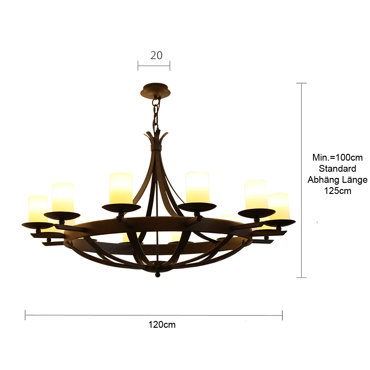 Die Pusta schwere imposante Krone beeindruckt mit einem Durchmesser von 128 cm und einem luxuriösen Design. Diese stilvolle Pendelleuchte, gefertigt aus geschmiedetem Eisen in braun-schwarz, bietet Platz für 12 E14 Leuchtmittel. Mit ihrer eleganten Form und dem hochwertigen Glas in Opalweiß und Champagner wird sie zum Hingucker in jedem Raum.