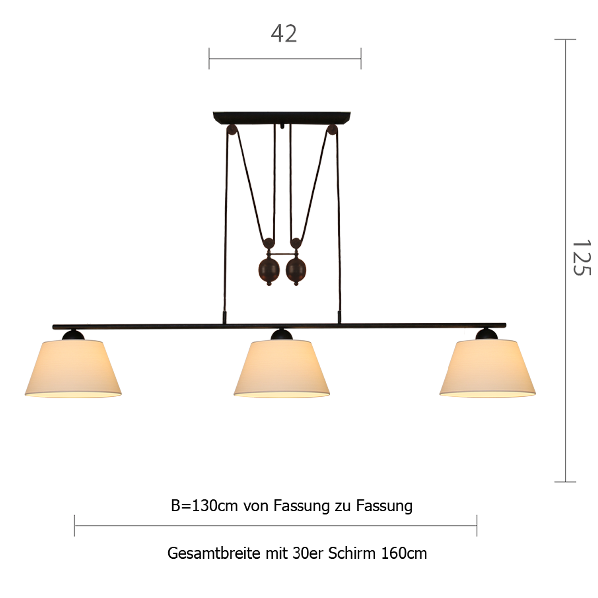 Die Zugleuchte besteht aus einer robusten Eisenmontur in einem eleganten Braun-Schwarz-Finish, das eine zeitlose Ästhetik vermittelt. Sie ist mit einem Textilkabel in Braun ausgestattet und bietet Platz für Lampenschirme bis zu einem Gewicht von 600 Gramm. Die drei E27-Fassungen sind für Leuchtmittel bis 60 Watt geeignet, was für ausreichend Beleuchtung sorgt.