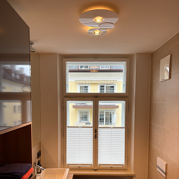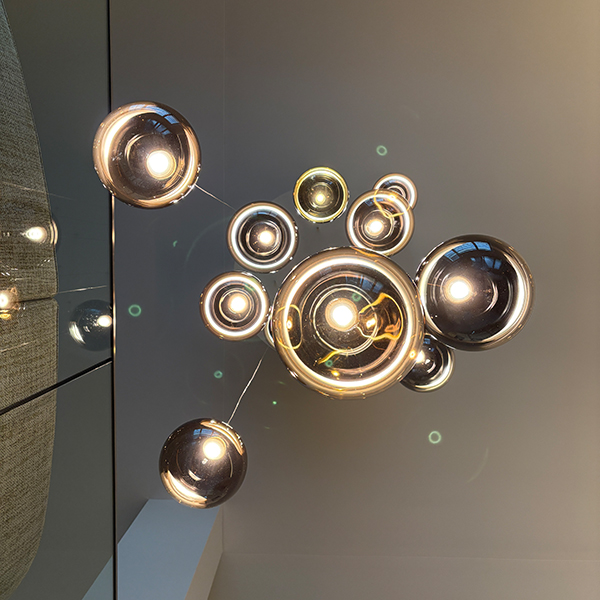 Eine konstruktive Besonderheit stellte die eingezogene Spanndecke dar, an der das Gehänge positioniert wurde. Um die Wartungsfreundlichkeit langfristig sicherzustellen, haben wir den großzügigen Baldachin mit einem Durchmesser von 120 cm abgehängt und mit einer integrierten Revisionsöffnung ausgestattet. Dadurch bleibt der Zugang zu den Trafos der zwölf Glaskugeln jederzeit gewährleistet.