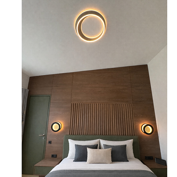Neben den Leuchten stammt auch ein Teil der Einrichtung aus unserem Haus: Das Sofa „Nimbo“ der Bielefelder Werkstätten überzeugt mit seinen weich fließenden Formen und wird zum Sinnbild für Geborgenheit und Entspannung. Darüber passend zu den runden Formen des Sofas die Fil de Fer von Catalani. Der dazugehörige Ruhesessel – ebenfalls von BW – ist bereits zum Lieblingsplatz des Hausherrn geworden. In den Schlafzimmern sorgen die Deckenleuchten „Tidal“ für eine ruhige und angenehme Lichtstimmung.