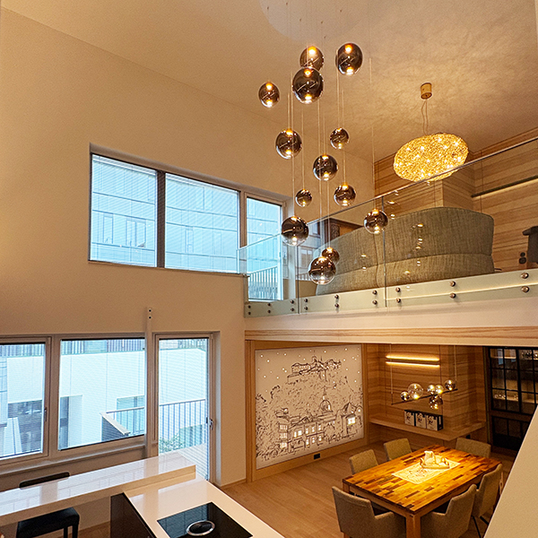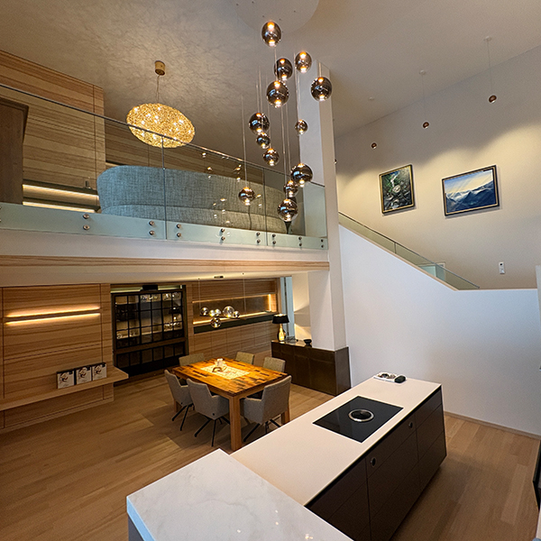 Zentrales Element ist das markante Gehänge im Luftraum über dem Küchenblock. Dieses ist bewusst so inszeniert, dass es auch vom Wohnbereich im Obergeschoss vollständig einsehbar ist. Durch die transparente Glasbrüstung entfaltet der Glas-Cluster von Lodes seine volle Wirkung und wird aus unterschiedlichen Perspektiven erlebbar.