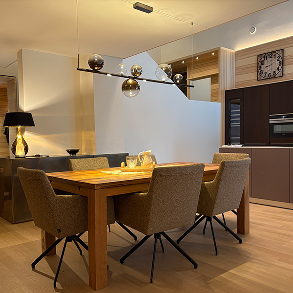 Über dem Esstisch ergänzt die „Random Stick“ von Lodes das Lichtkonzept. In Kombination mit dem Glas-Cluster „Random Solo“ entsteht ein stimmiges Gesamtbild mit hoher gestalterischer Präsenz.