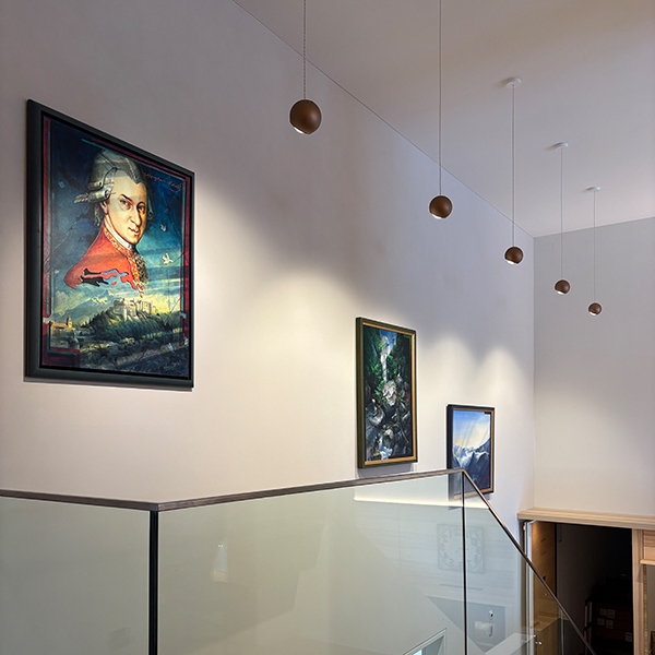 Auch die Beleuchtung der großformatigen Bilder entlang der hohen Wand parallel zur Treppe erforderte eine durchdachte Lösung. Hier kamen die „Spider“-Leuchten von Lodes zum Einsatz. Dank ihrer drehbaren Diffusoren lassen sich die Lichtkegel präzise ausrichten und setzen die eindrucksvollen Kunstwerke optimal in Szene.