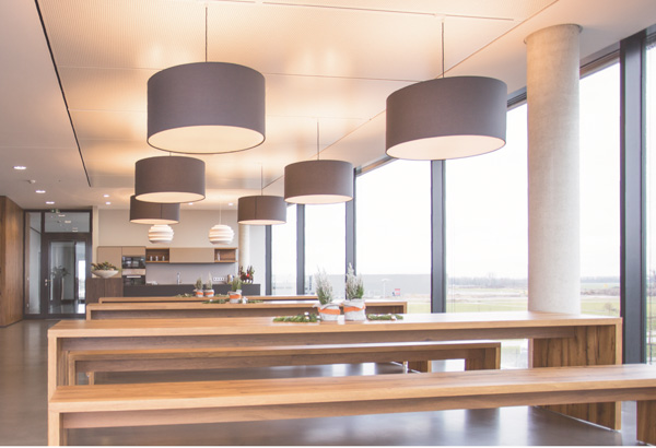 Pendel mit 50cm Durchmesser und einer Höhe von 40cm beleuchten diesen Besprechungstisch und die Tische der großzügigen Kantine.