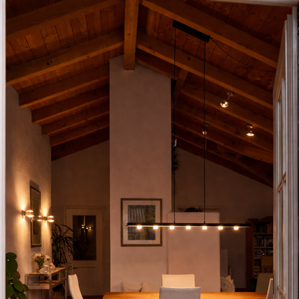 Mit unserem ANTEO LED-Balken schaffen wir Atmosphäre – auch bei anspruchsvollen Raumhöhen bis 5m. Für dieses Projekt wurde die Leuchte mit einer Abhängung von 3,65 m individuell realisiert. Die stufenlos dimmbare und in der Lichtfarbe flexibel anpassbare Beleuchtung ermöglicht es, die Stimmung im Raum präzise zu inszenieren. Dank integrierter Höhenverstellung lässt sich das Licht jederzeit perfekt auf Nutzung und Situation abstimmen.