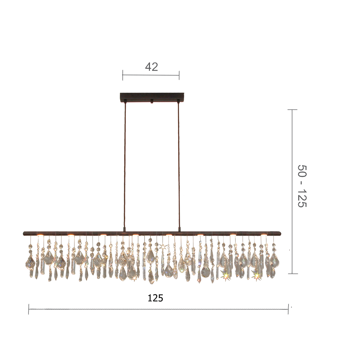 Die Anteo LED Hängeleuchte mit einer Länge von 125 cm und 8 x 3,6W LED's entspricht ca. 2500Lumen ist ein Meisterwerk der Beleuchtung. Sie kombiniert braun-schwarz getöntes Metall mit 20 abnehmbaren Kristallbehängen und verleiht jedem Raum einen einzigartigen Charme. Perfekt für anspruchsvolle Kunden, die Qualität, Design und Funktionalität schätzen.