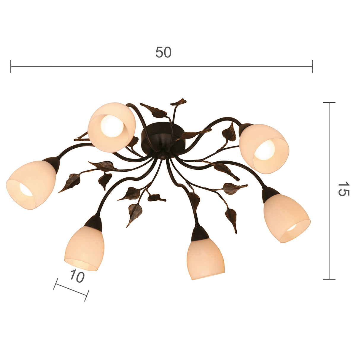 Die Chalet Deckenleuchte besticht durch ihre Verwendung von geschmiedetem Eisen in einem eleganten Braun-Schwarz. Die Zierblätter verleihen der Leuchte ihren unverwechselbaren Charakter. Wählen Sie zwischen opalem oder scavo Glas, um die perfekte Lichtstimmung zu kreieren. Diese Leuchte ist mehr als ein Lichtspender – sie ist ein Design-Statement.