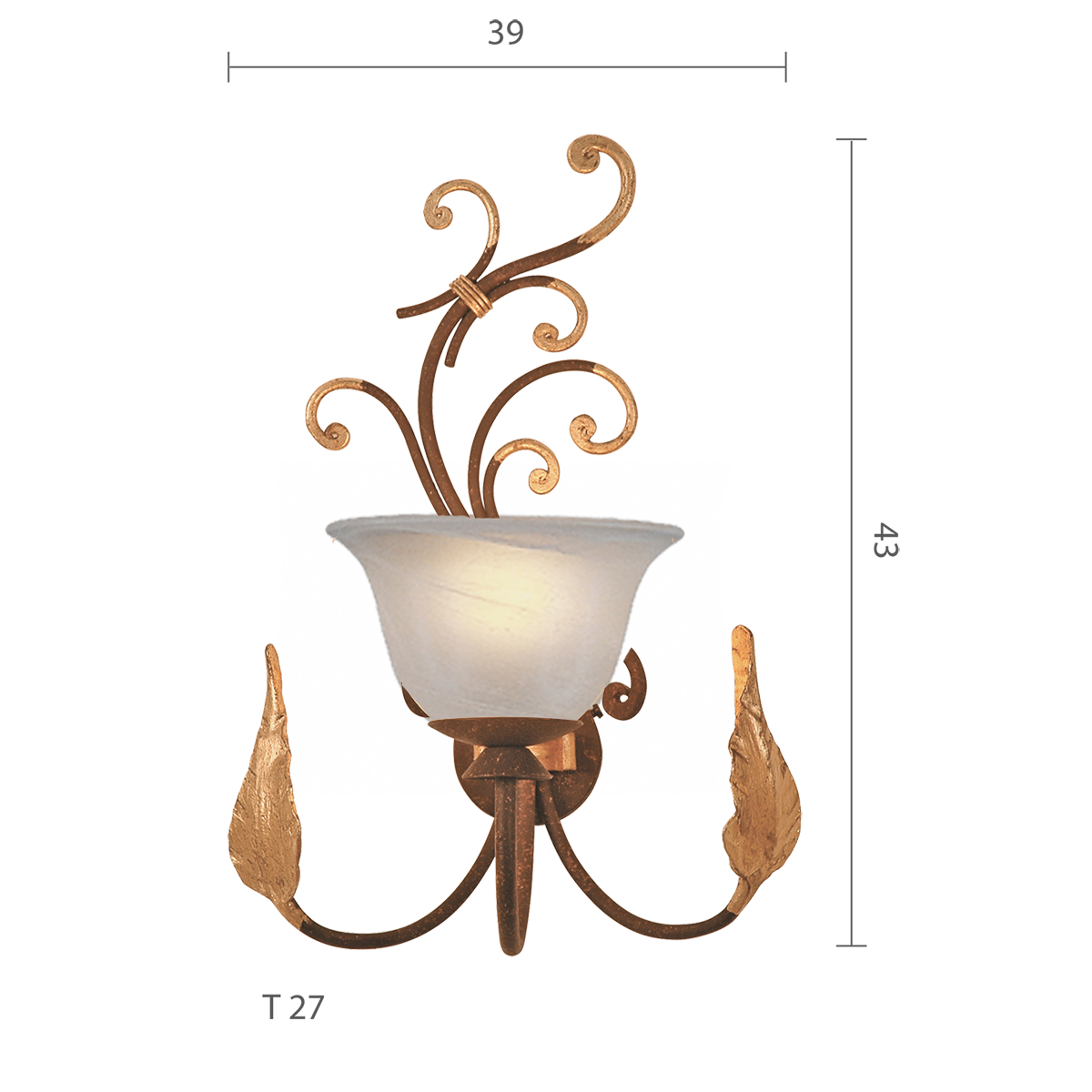 Die Florence Wandleuchte besticht durch ihr hochwertiges Glas-Alabaster und das kunstvoll gearbeitete Schmiedeeisen in braun-schwarz getupfter Optik. Das florentinische Design wird durch Zierelemente aus echtem Blattgold abgerundet, was der Leuchte einen zeitlosen und edlen Charakter verleiht.