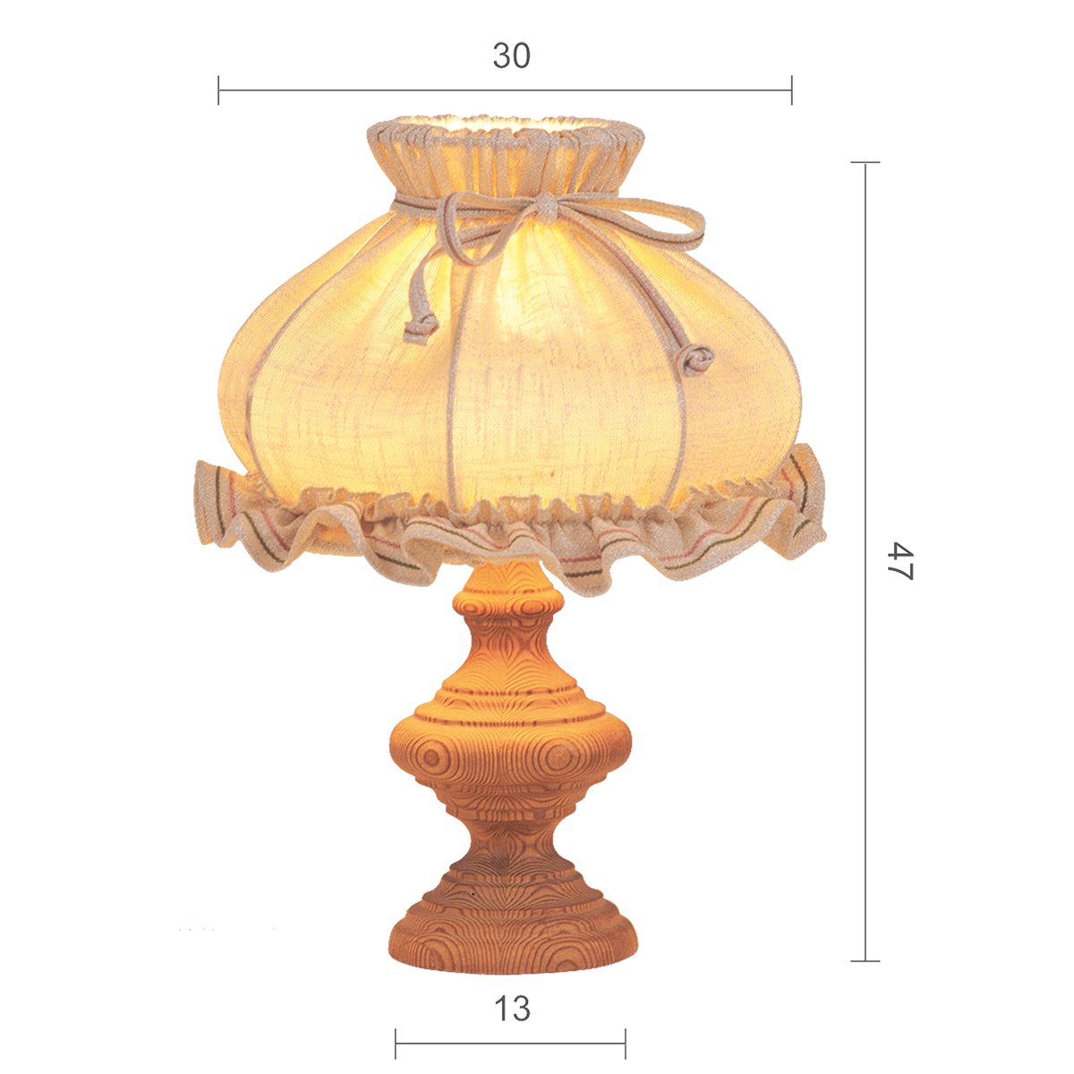 Die Tischleuchte beeindruckt durch ihr robustes Fichtenholz, das in einem hellen Ton gebürstet wurde, und den eleganten Stoffschirm aus Leinen. Der Schirm in Zwiebelform mit einem Durchmesser von 30 cm ist mit Rüschen und Band verziert. Der Bezug ist leicht abnehmbar und waschbar, was eine einfache Pflege ermöglicht.