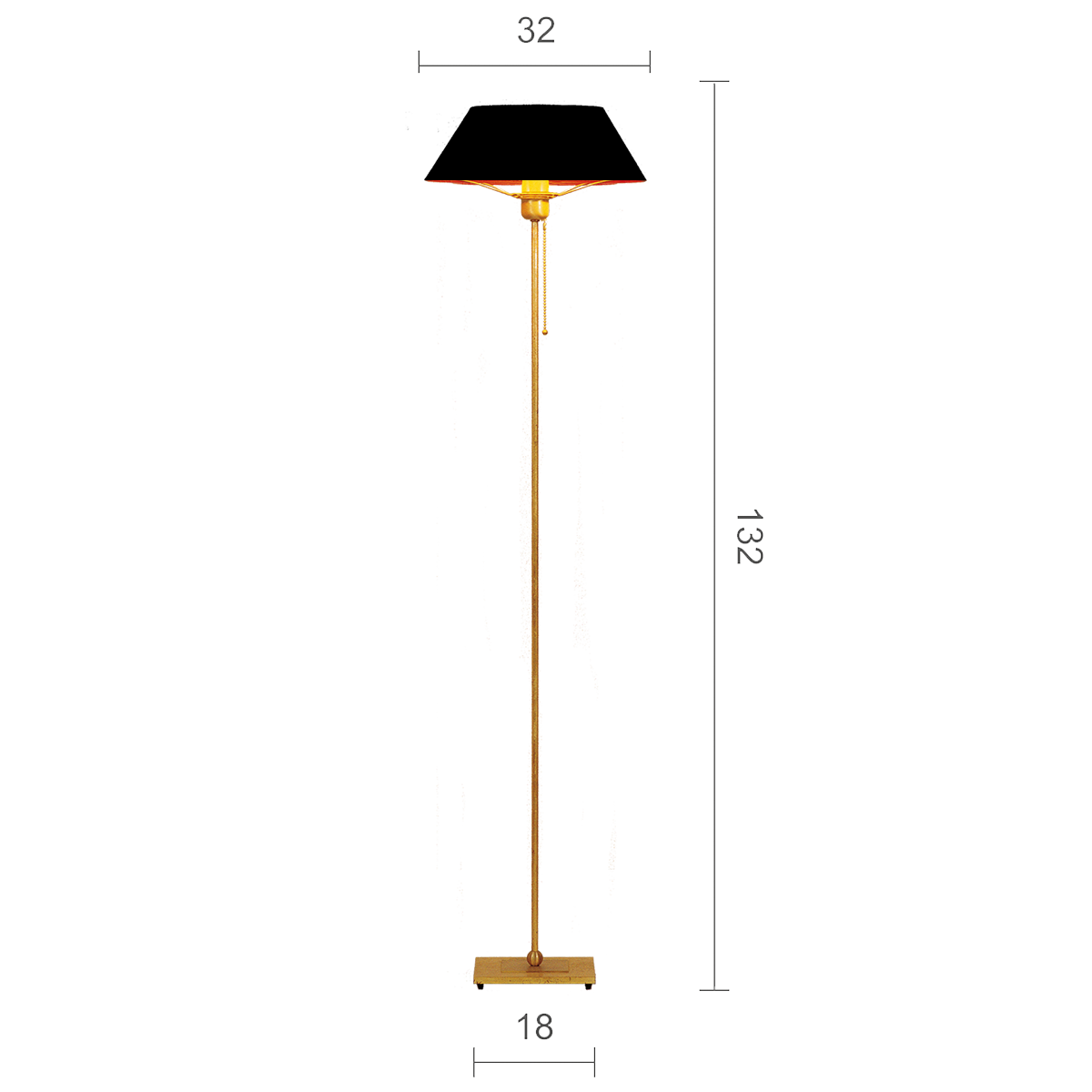 Diese Standleuchte beeindruckt durch ihre exklusive Materialkombination: Ein stabiler Eisenfuß mit feiner Blattgoldveredelung sorgt für Luxus, während der Strichlack Lampenschirm in klassischem Schwarz zeitlose Eleganz ausstrahlt. Der Durchmesser des Schirms beträgt 32 cm, was ein ausgewogenes Lichtspiel ermöglicht.