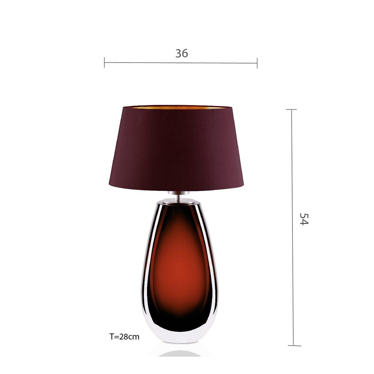 Dekorative, edle und elegante Tischleuchte im Muranoglas Stil mit modernem, schlichten Design, Farbton Marone Überfangglas mit Edelstahlmontur, 1 x E27, max. 40 Watt, Schnurdimmer LED, Schirm oval konisch E27, Halterung unten 5cm vertieft, Gesamthöhe: 54 cm. Hier abgebildet mit oval konischem Schirm ROK36/28/20.5SE- G.AUB-348 Goldkarton nicht durchscheinend, außen Seide Aubergine-348. Suchen Sie sich Ihre Wunschfarbe in der Farbkarte aus. Leuchtmittel bitte separat bestellen.