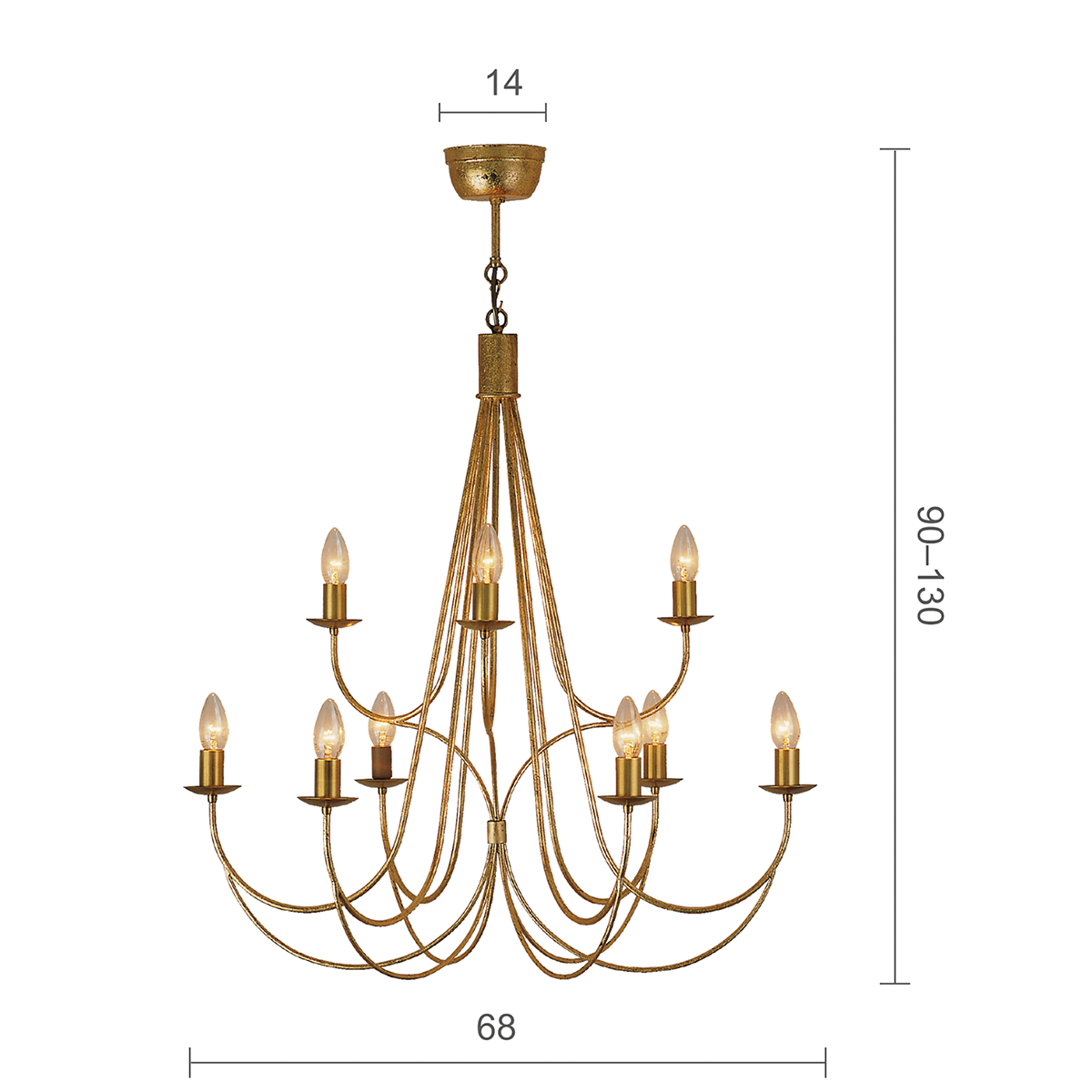 Die Opera Krone besteht aus hochwertigem Eisenrohr, das kunstvoll mit Blattgold belegt ist, um einen unvergleichlich edlen Look zu erzeugen. Der filigrane Aufbau der Leuchte zeugt von höchster Handwerkskunst und sorgt für eine harmonische Lichtverteilung in jedem Raum. Sie ist mit 9 E14 Fassungen ausgestattet und lässt sich individuell anpassen.