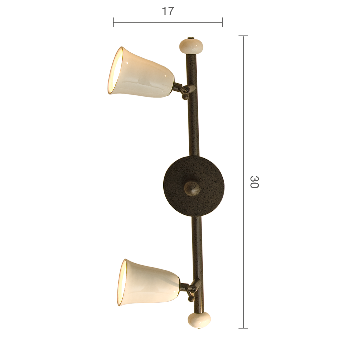 Die Provence Keramik 2er Spotleiste besticht durch ihre raffinierte Kombination aus robustem Eisen und eleganter Keramik. Die Keramikspots sind an einem stabilen Gelenk befestigt, was eine flexible Ausrichtung des Lichts ermöglicht. Das braun-schwarz getupfte Eisen verleiht der Lampe einen rustikalen Charme, während die glänzende weiße Keramik einen edlen Kontrast bildet.