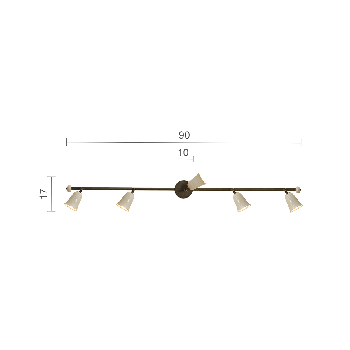 Die Leuchte besteht aus hochwertigem Eisen, das in einem eleganten braun-schwarz getupften Finish gehalten ist. Die Keramikteile sind in einem glänzenden Weiß gehalten, was der Leuchte eine edle und zugleich rustikale Optik verleiht. Fünf individuell ausrichtbare GU10 Spots bieten Flexibilität in der Ausleuchtung und setzen stilvolle Akzente.