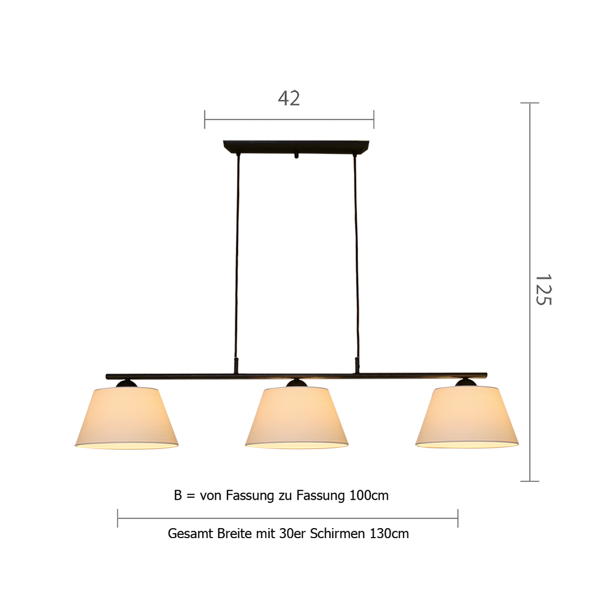 Die Pusta Balken Pendelleuchte vereint herausragende Qualität und stilvolles Design. Mit einer Länge von 130 cm ist sie ideal für große Tischplatten und bietet mit ihren drei E27 Fassungen flexibles Licht für jeden Raum. Die Kombination aus braun-schwarz getupftem Eisen und einem eleganten Strichlack-Schirm macht diese Leuchte zu einem echten Blickfang.