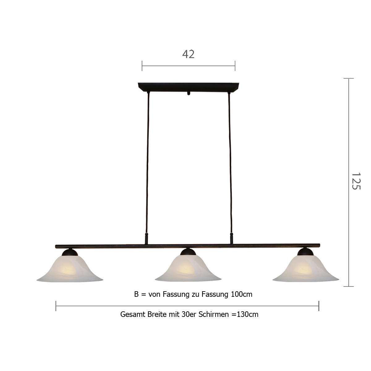 Diese Leuchte besteht aus einem robusten, ovalen Rohr aus Eisen, das in einem edlen braun-schwarz getupften Finish gehalten ist. Mit drei E27 Fassungen und einer maximalen Leistung von 60 Watt, wird Ihre Beleuchtung zum Highlight. Der Glas Alabaster Schirm mit einem Durchmesser von 30 cm verleiht der Lampe eine zeitlose Eleganz, die sowohl modern als auch klassisch wirkt.