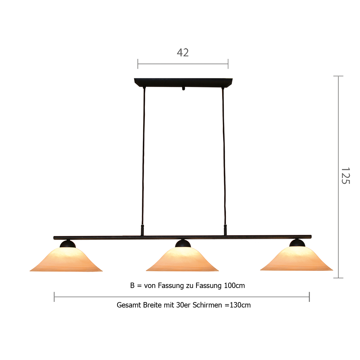 Gefertigt aus robustem Eisen, überzeugt die Pusta Balkenleuchte durch ihre brünierte Oberfläche, die eine edle Optik bietet. Die drei E27 Fassungen sind für Leuchtmittel bis zu 60 Watt geeignet. Das kürzbare Textilkabel ermöglicht eine flexible Anpassung an Ihre Raumhöhe. Die Rauchgläser mit einem Durchmesser von 30cm setzen stilvolle Akzente und schaffen ein harmonisches Lichtspiel.