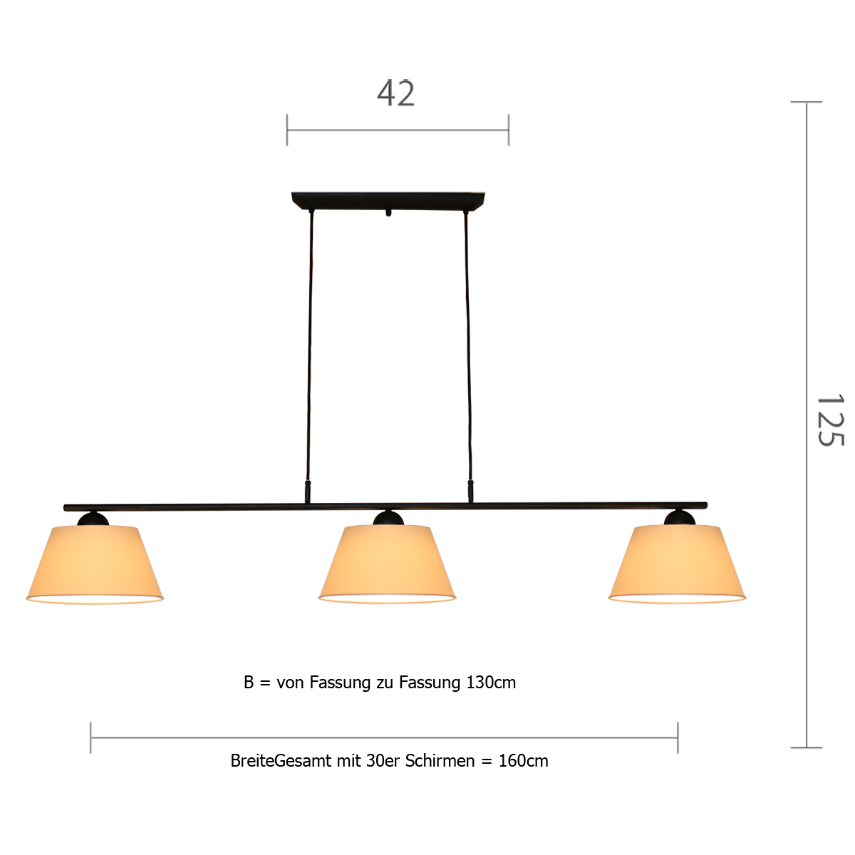 Diese Leuchte besticht durch ihre hochwertigen Materialien und das ansprechende Design. Der braun-schwarz getupfte Eisenbalken harmoniert perfekt mit den stilvollen Chintz- oder Leinen-Schirmen. Mit den drei E27-Fassungen und einer maximalen Leistung von 60 Watt bietet sie nicht nur ein optisches Highlight, sondern auch beeindruckende Lichtstärke.