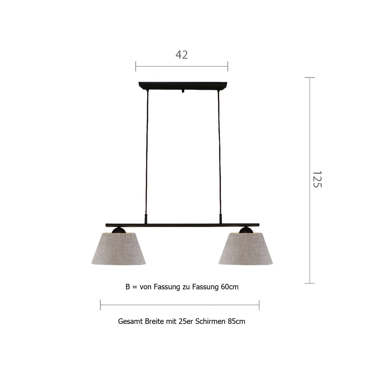 Die Pusta Balken Leuchte ist optimal für Tische von 120-150cm Länge. Mit zwei E27 Fassungen und einer maximalen Leistung von 60 Watt bietet sie ausreichend Licht. Dank des kürzbaren Textilkabels können Sie die Höhe individuell anpassen und so die perfekte Beleuchtung für Ihren Raum schaffen.