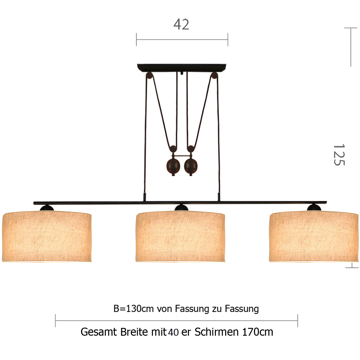 Mit ihrer höhenverstellbaren Funktion passt sich die Hängeleuchte perfekt an verschiedene Tischlängen von 210-280 cm an. Die kürzbaren Textilkabel ermöglichen individuelle Anpassungen, während die drei E27 Fassungen für vielseitige Beleuchtungsoptionen sorgen. Dekorieren Sie die Leuchte individuell mit unseren Themenmotiven und passen Sie sie so an Ihre Einrichtung an.