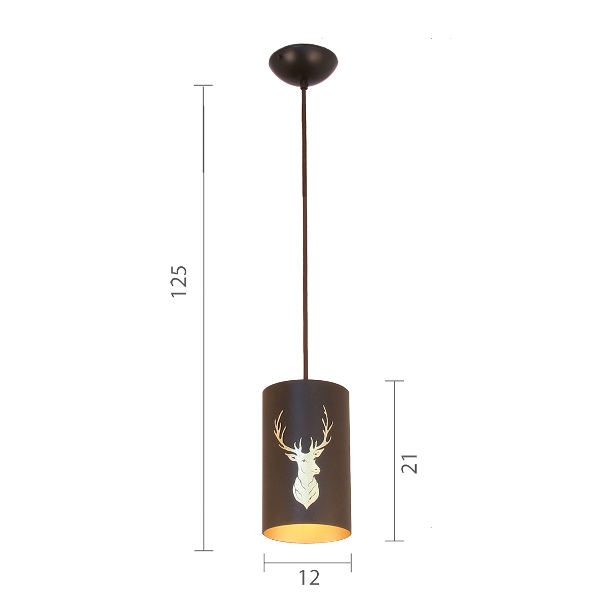 Die Solo Pendel Form Tonne vereint zeitlose Eleganz mit moderner Funktionalität. Mit einem Durchmesser von 12 cm und einer stilvollen braun-schwarzen Eisenoberfläche, die von goldenen Hirschkopf-Applikationen akzentuiert wird, ist diese Lampe ein wahrer Blickfang. Das kürzbare Textilkabel bietet Flexibilität, während die E27-Fassung für vielseitige Beleuchtungsmöglichkeiten sorgt.