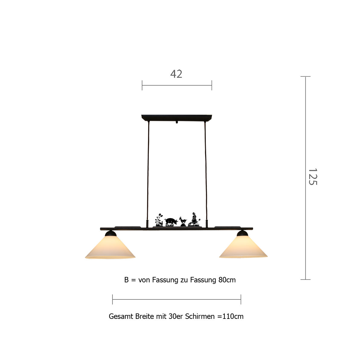 Die Leuchte ist mit zwei E27-Fassungen ausgestattet und unterstützt Leuchtmittel bis 60 Watt, die separat erhältlich sind. Das kürzbare braune Textilkabel ermöglicht eine flexible Anpassung der Höhe. Ideal für eine stimmungsvolle Beleuchtung von Essbereichen und langen Tischen, bietet sie sowohl Funktion als auch dekorative Vielseitigkeit.