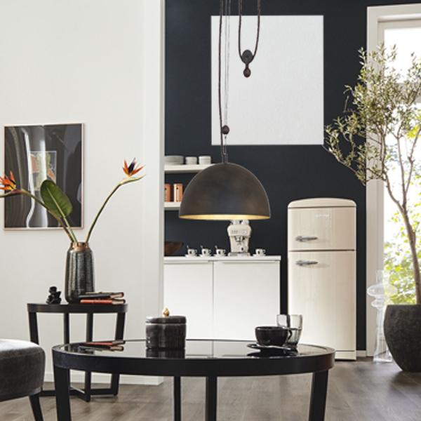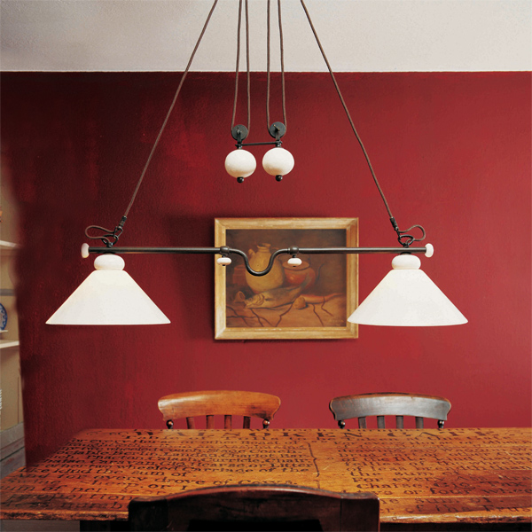 Die Doppelzugleuchte von Menzel aus der Familie Provenve für große längliche Tische, in der Breite und Höhe verstellbar, für Tische ab 130cm bis 180cm Gewicht der Gläser bis je 850 Gramm, Eisen braun-schwarz getupft, Zierteile Keramik weiß glänzend.
