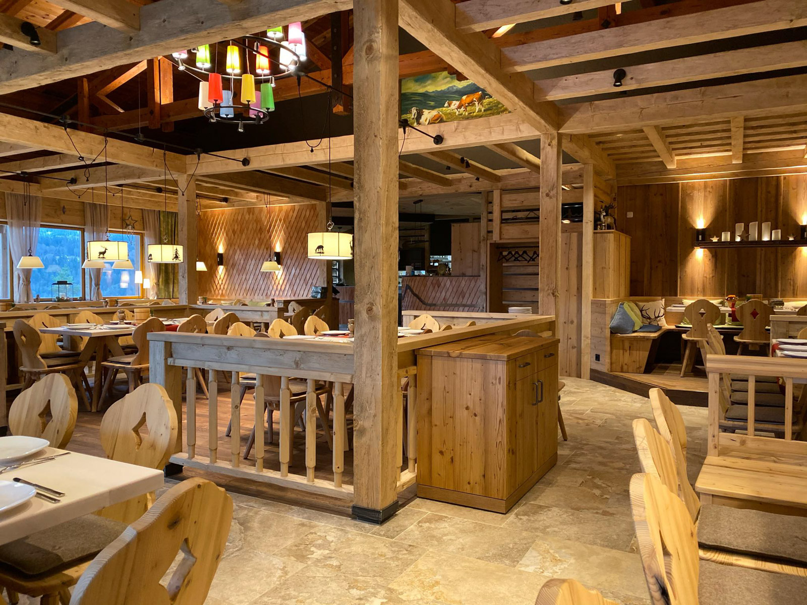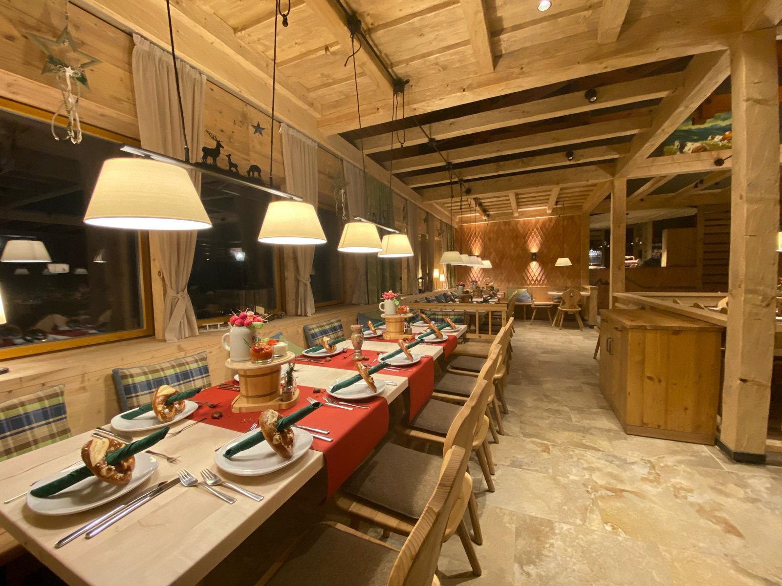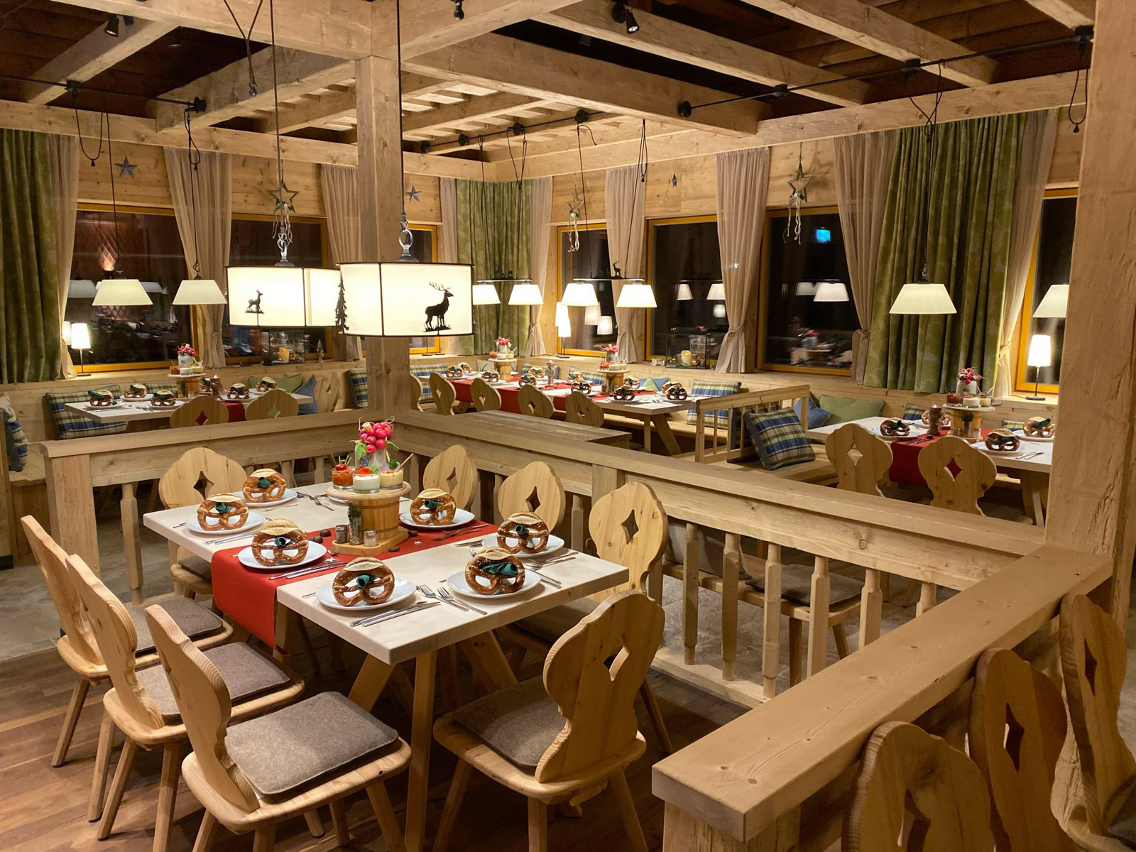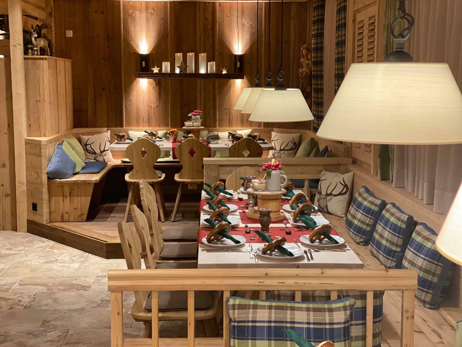 Im Zentrum des Raumes wurde eine beeindruckende, doppeltürmige Krone mit Strichlack-Schirmen platziert, die nicht nur ein optisches Highlight darstellt, sondern auch für ausreichend Licht sorgt. Zusätzlich wurden Unterspots an der Krone installiert, um die Tische optimal auszuleuchten und eine gemütliche, funktionale Beleuchtung zu gewährleisten.