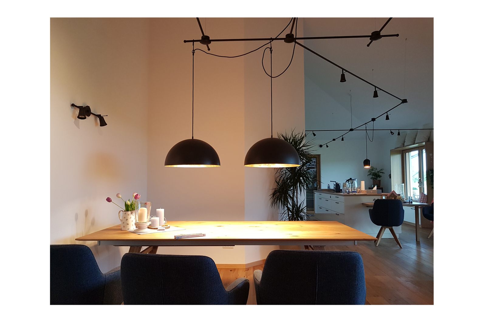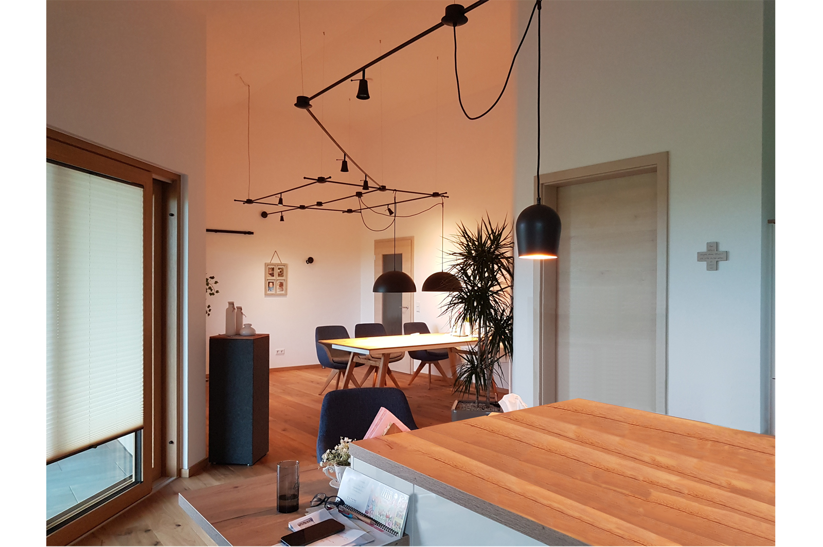 Die Gestaltung der Beleuchtung für eine großzügige Wohnküche mit offenem Dach und schrägen Decken bis zu einer Raumhöhe von 4,5 Metern stellte eine besondere Aufgabe dar. Ziel war es, den Raum sowohl gemütlich als auch praktisch auszuleuchten. Zwei vorhandene Stromauslässe mit 5-adriger Zuleitung boten eine gute Grundlage für eine flexible Lösung.